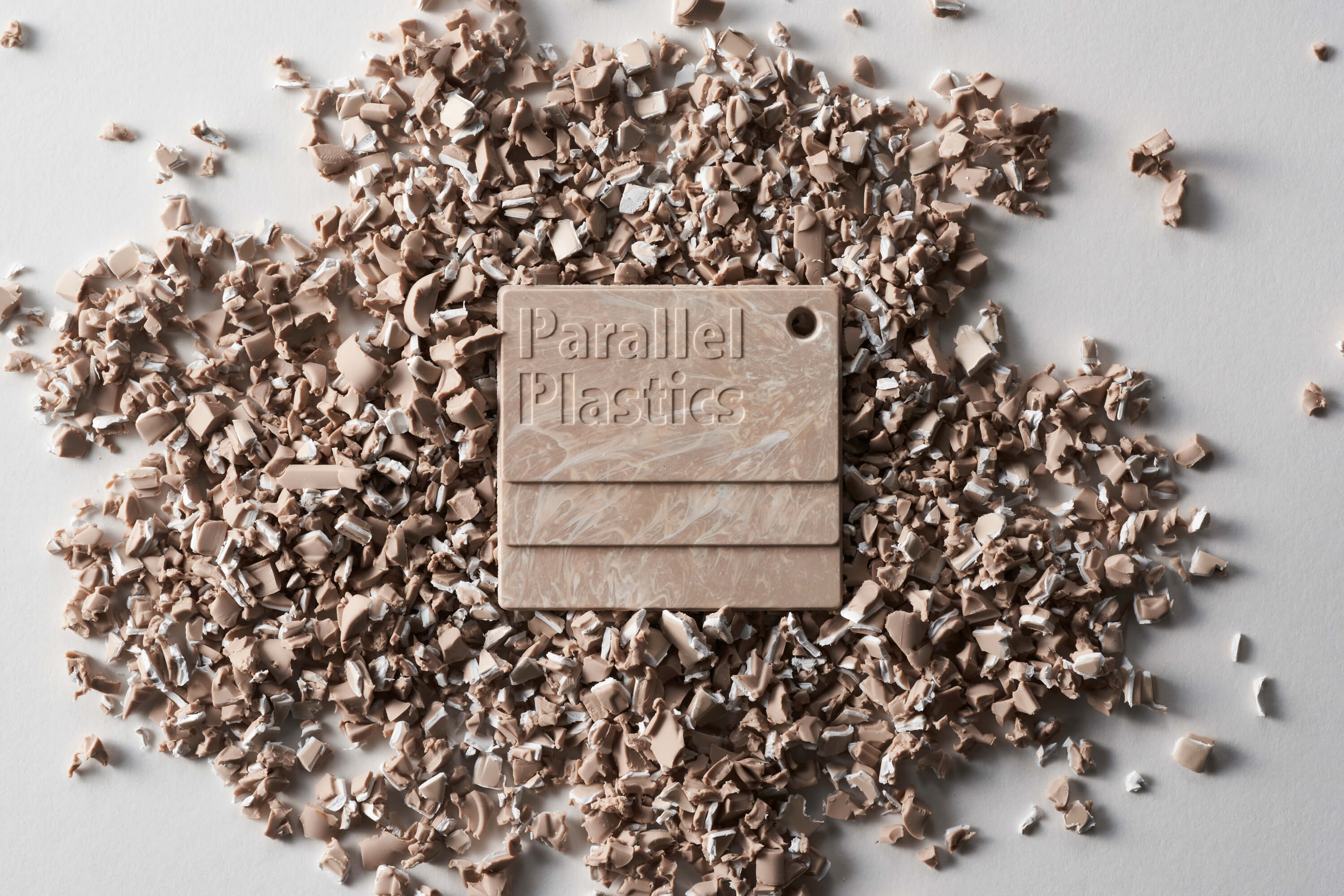 マテリアルリサイクルの「もうひとつの方法」として誕生したリサイクルプラスチックサービス、Parallel Plastics(パラレルプラスチックス)。素材ごとに分別して、洗浄、さらにバージンプラスチックを足して再生する従来のリサイクルではなく、ローエネルギー・ローコストを目指し、そのままリサイクルする方法を提供している。異なる色や組成のプラスチックを混ぜることで生まれる、天然物のような美しいテクスチャが最大の特徴。そのテクスチャをいかした強度の要らないプロダクトへの転換を提案している。